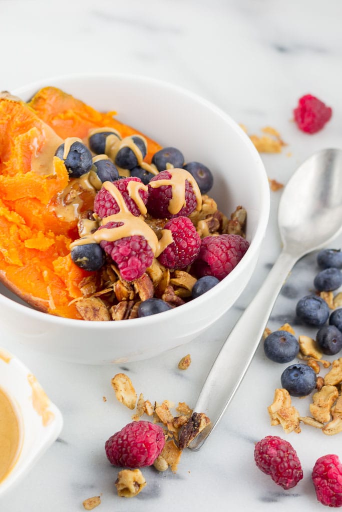I love eating this baked sweet potato breakfast bowl with berries in the morning. It keeps me full until lunch time which is awesome because I tend to find myself snacking a lot in the morning after eating breakfast.