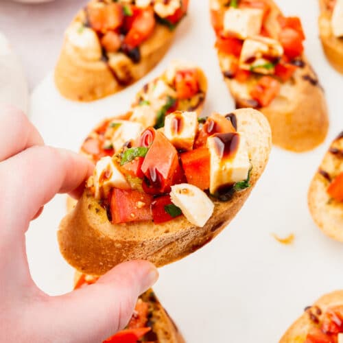 Store leftover toasted baguette slices and tomato mozzarella mixture separately in airtight containers. The toasted bread will keep at room temperature for up to 1 day. The tomato mixture can be refrigerated for up to 2 days, though it’s best served the same day it’s made as it becomes watery after sitting.