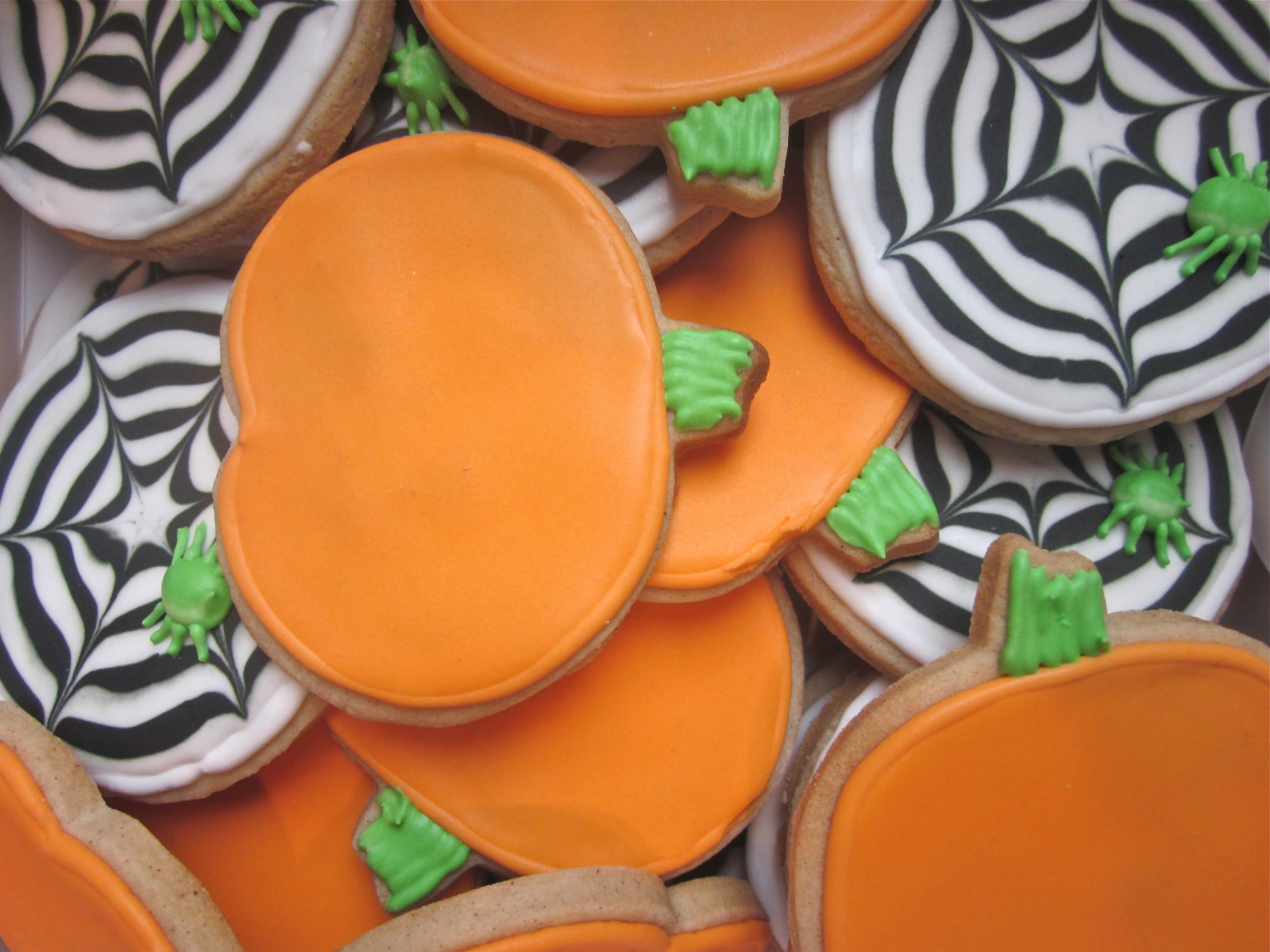 - Let dry for a few hours or overnight. When the icing is dry on the cookie, using a #7 tip (or any other large circular tip), pipe a circle with the thicker icing (10-second icing) in green until it resembles the body of a spider.