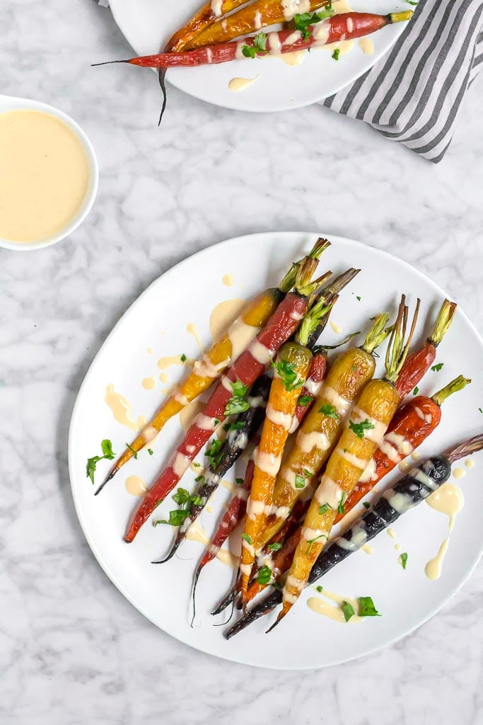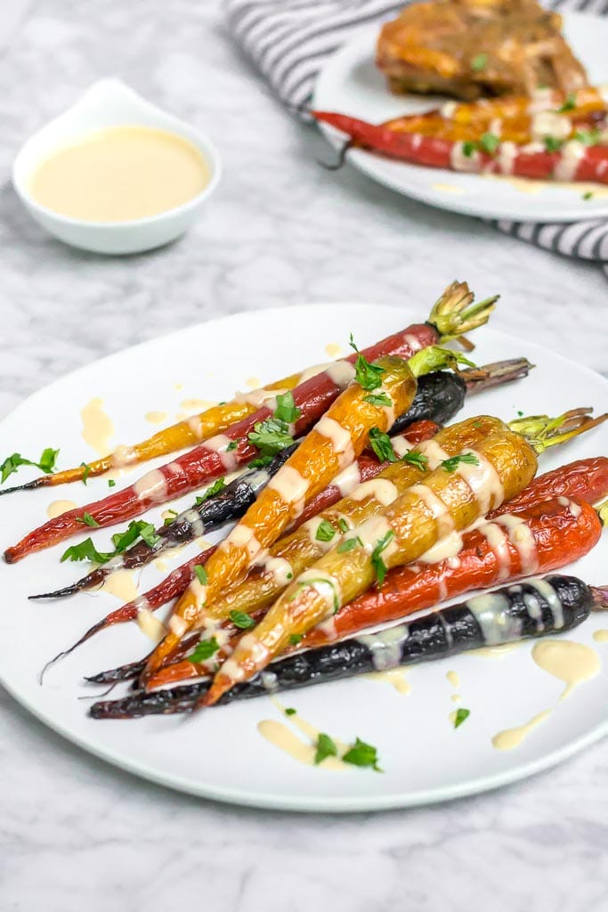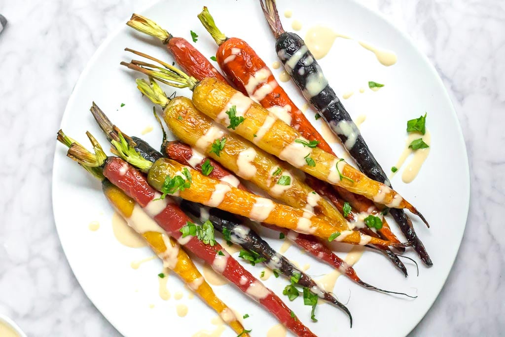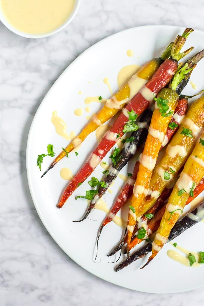 Roasted Rainbow Carrots with Lemon Tahini Sauce