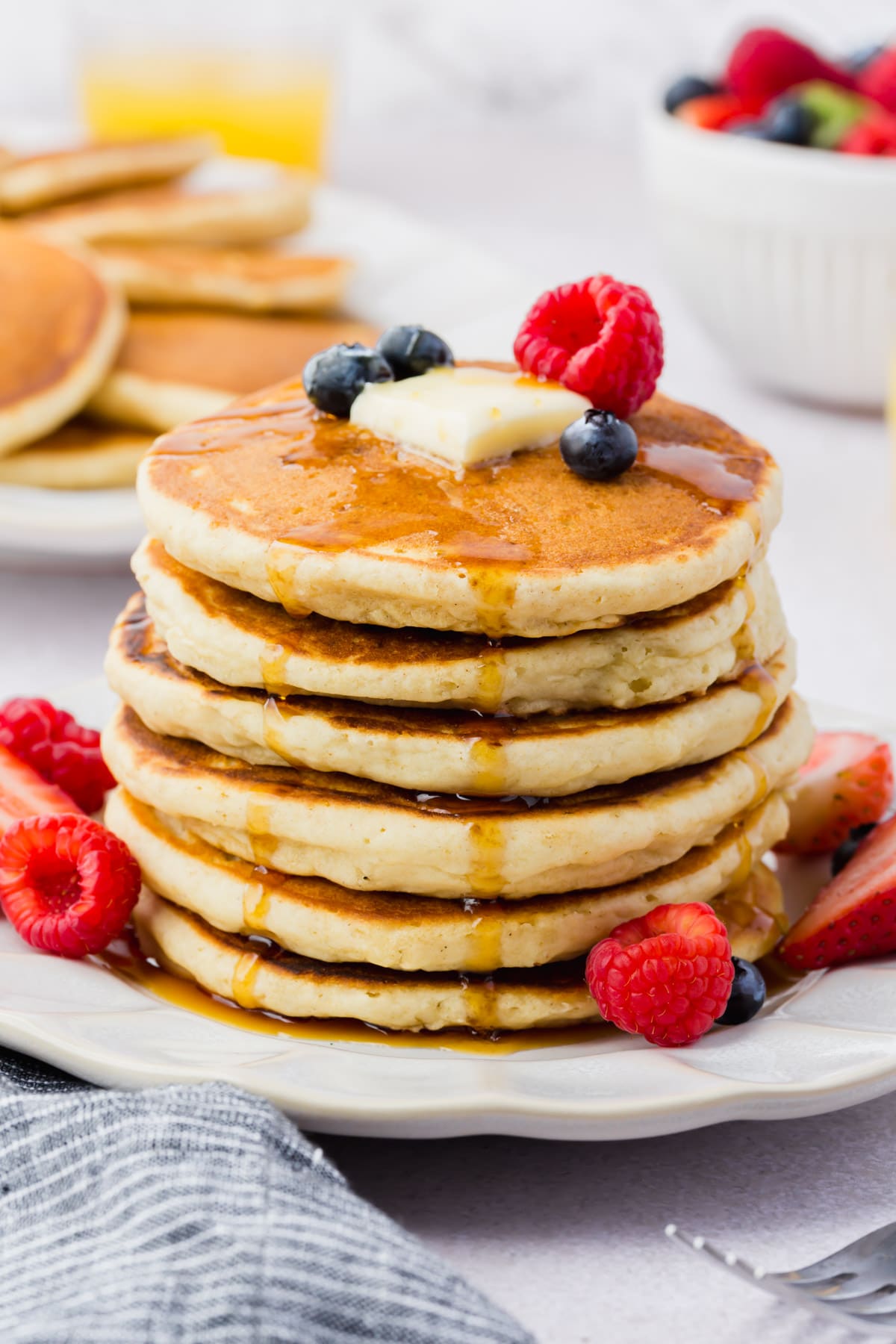 Cook on the other side for an additional 2-3 minutes until cooked through. Remove from the griddle and place on a plate. Repeat with the remaining pancake batter.
