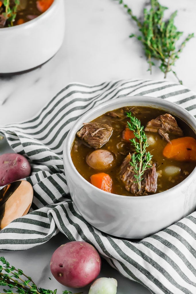 If you are are making this stew Paleo or Whole30-compliant, you can use the tapioca flour to thicken the stew. If you do not need to follow these guidelines and instead only need your stew to be gluten-free, you can use the cornstarch instead.