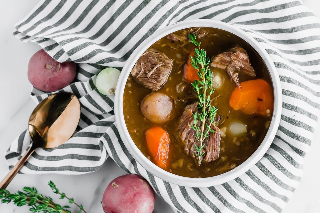 Typically stews are thickened with all-purpose flour. Instead, I use tapioca starch or cornstarch in this recipe to thicken the stew.
